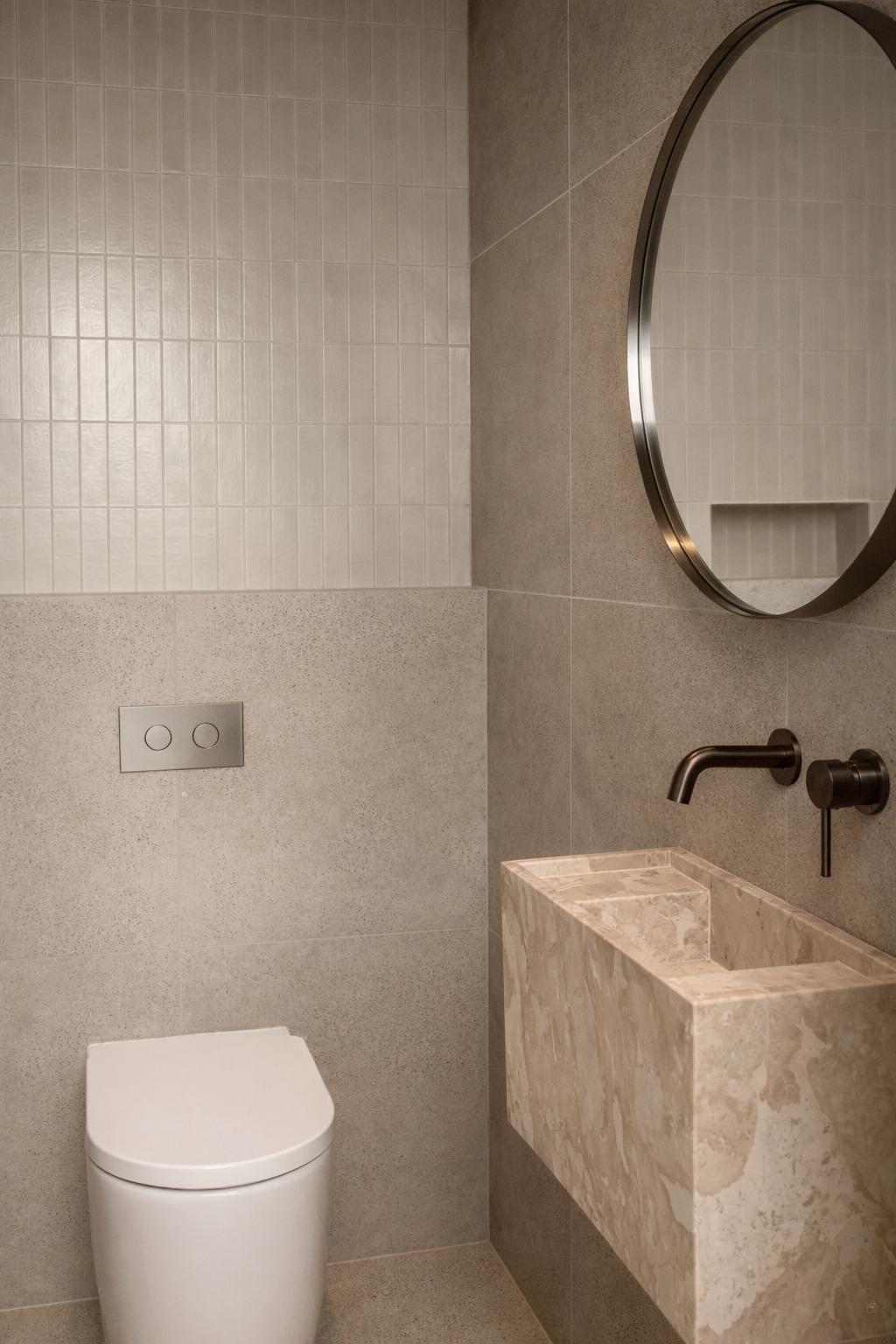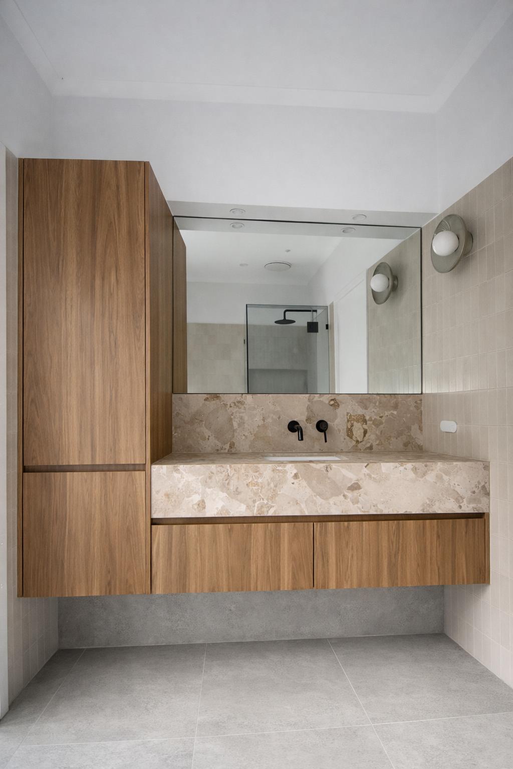 Vanities were designed as monolithic stone forms, anchoring each space with mass and tactility. Custom joinery in warm timber veneer introduces contrast and depth against a refined, earthy tile selection.
