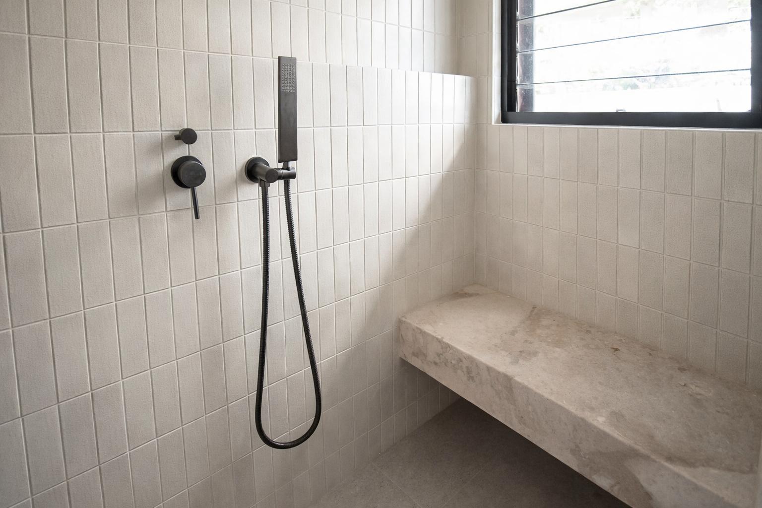 Showers were reconfigured to prioritise volume and comfort, with integrated stone seating reinforcing the architectural quality of the rooms. Light, texture and proportion work together to create a bathing environment that feels composed and intentional.