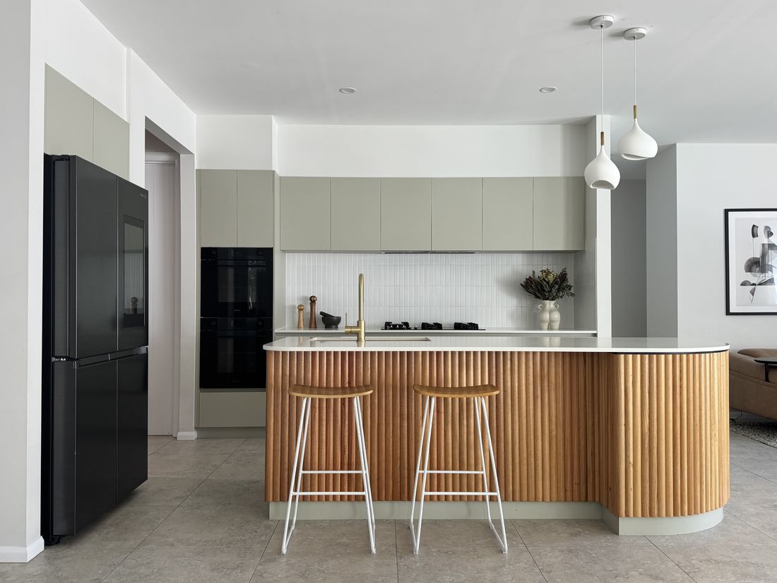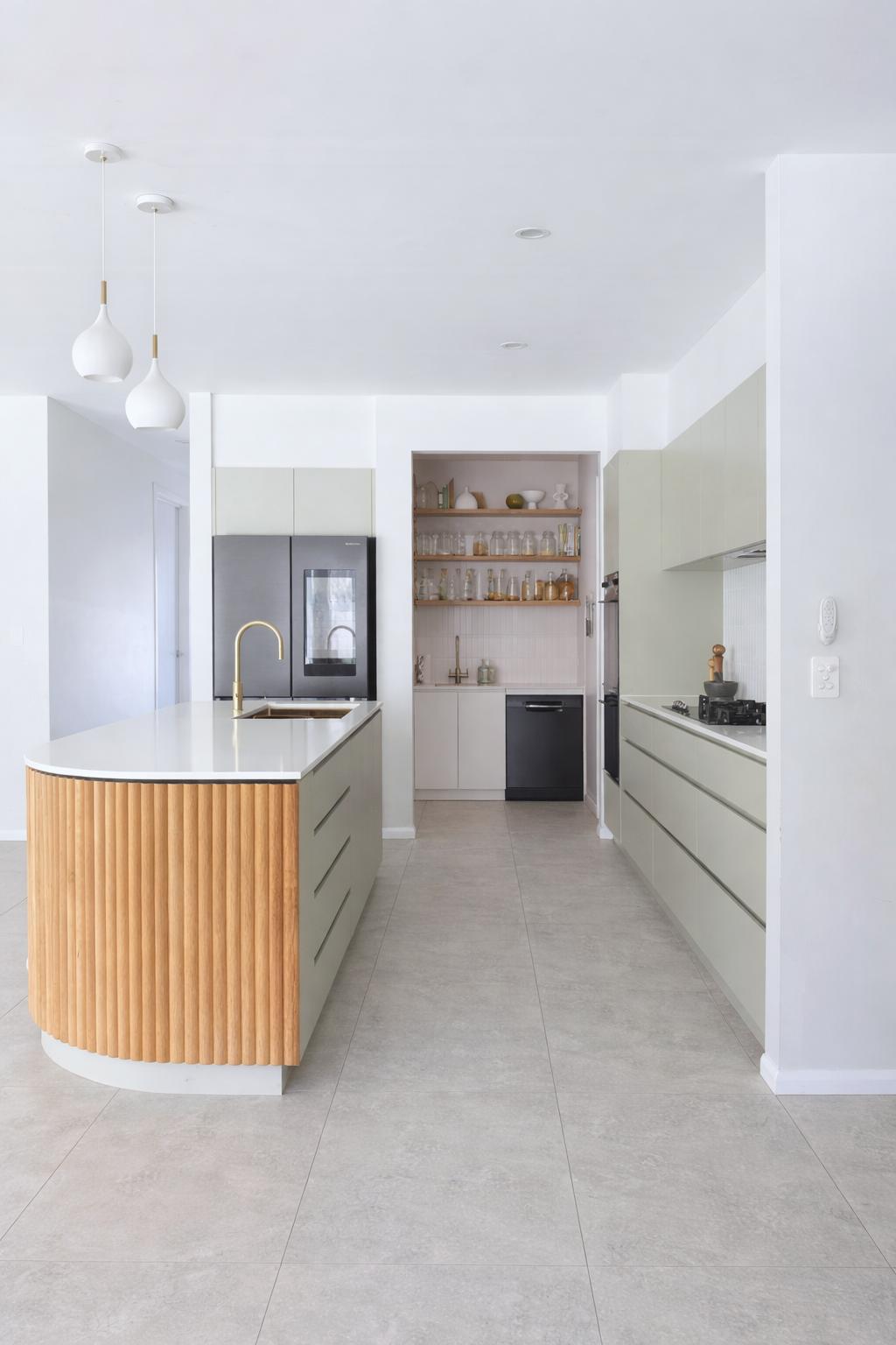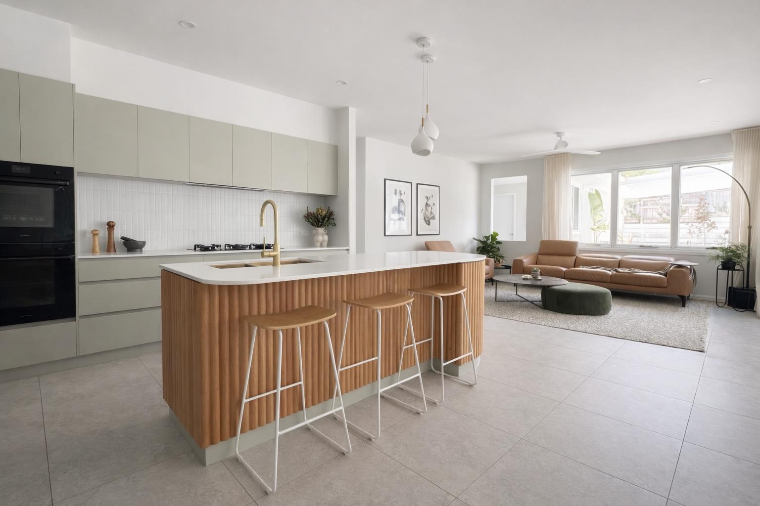 Material selections were restrained and tonal. Soft neutral cabinetry, stone benchtops and fluted timber detailing introduce warmth and texture without excess. The kitchen island was designed as a sculptural anchor to the living space — balanced in scale and built for daily use.