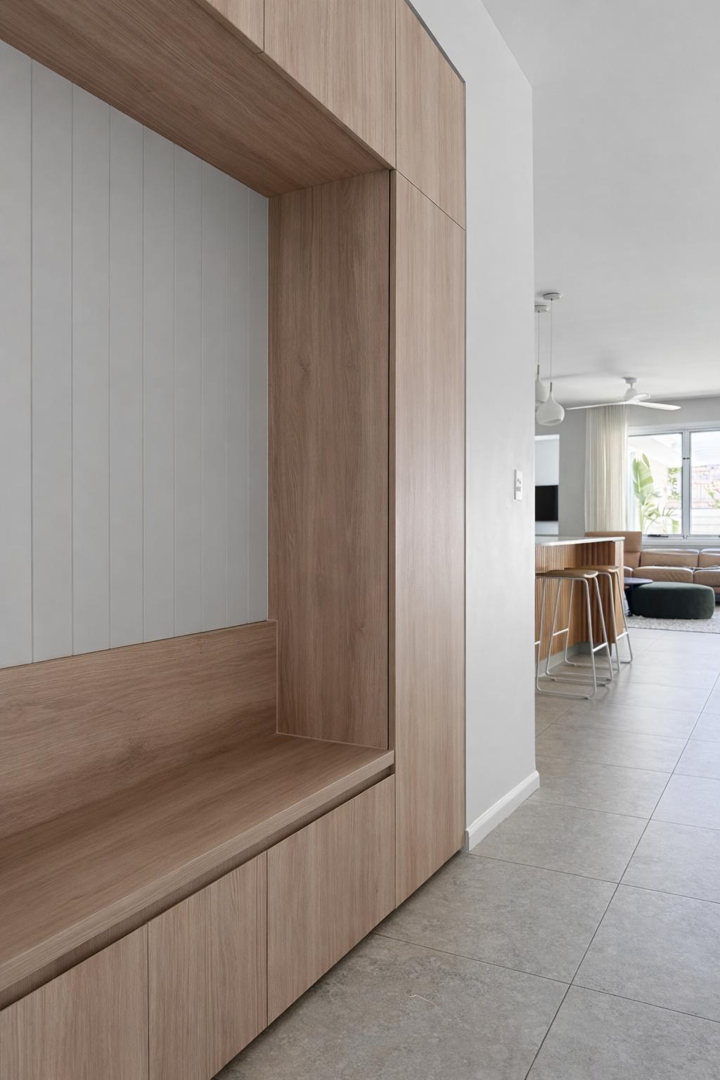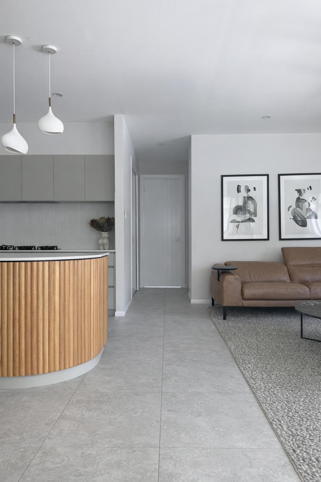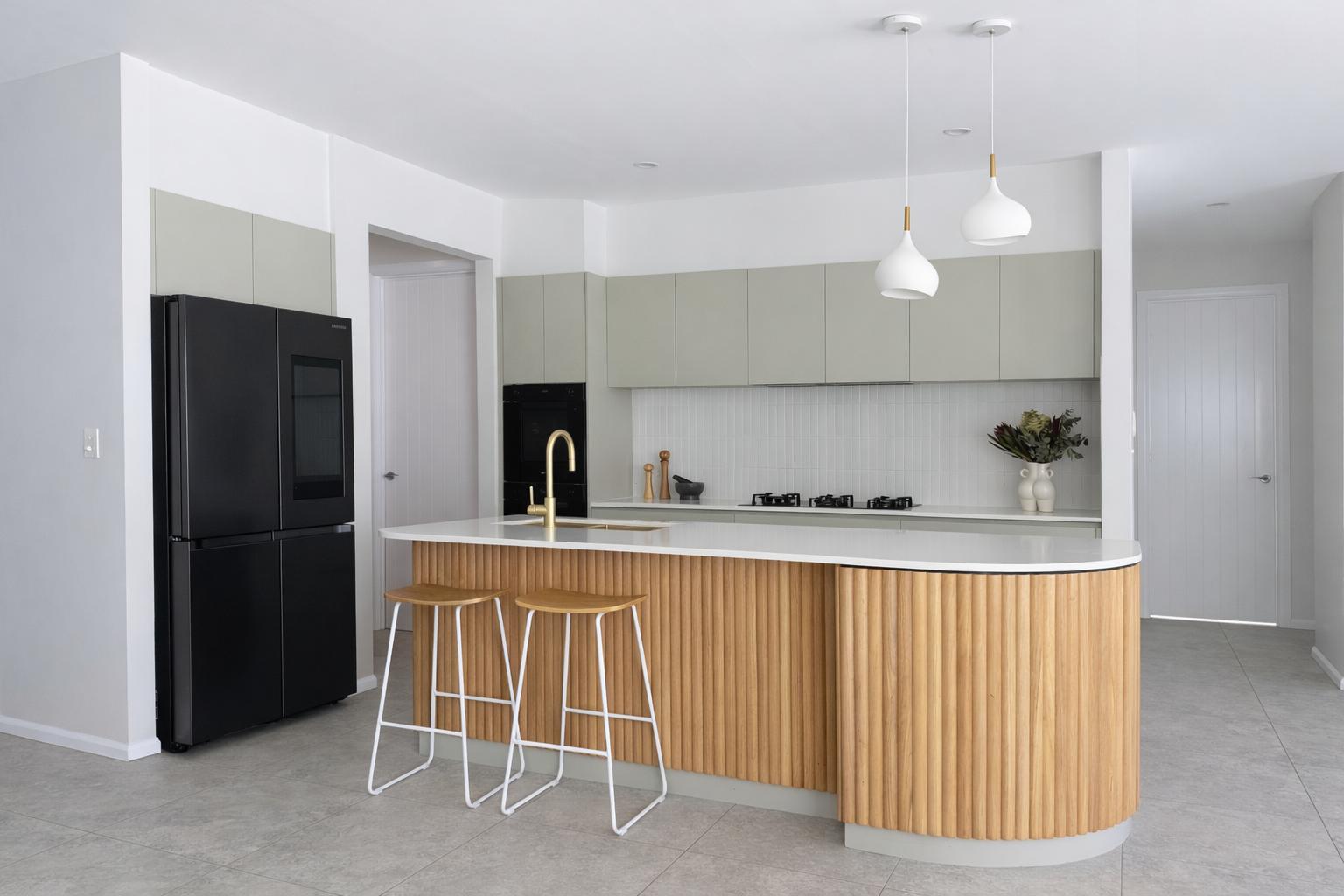 Material selections were restrained and tonal. Soft neutral cabinetry, stone benchtops and fluted timber detailing introduce warmth and texture without excess. The kitchen island was designed as a sculptural anchor to the living space — balanced in scale and built for daily use.