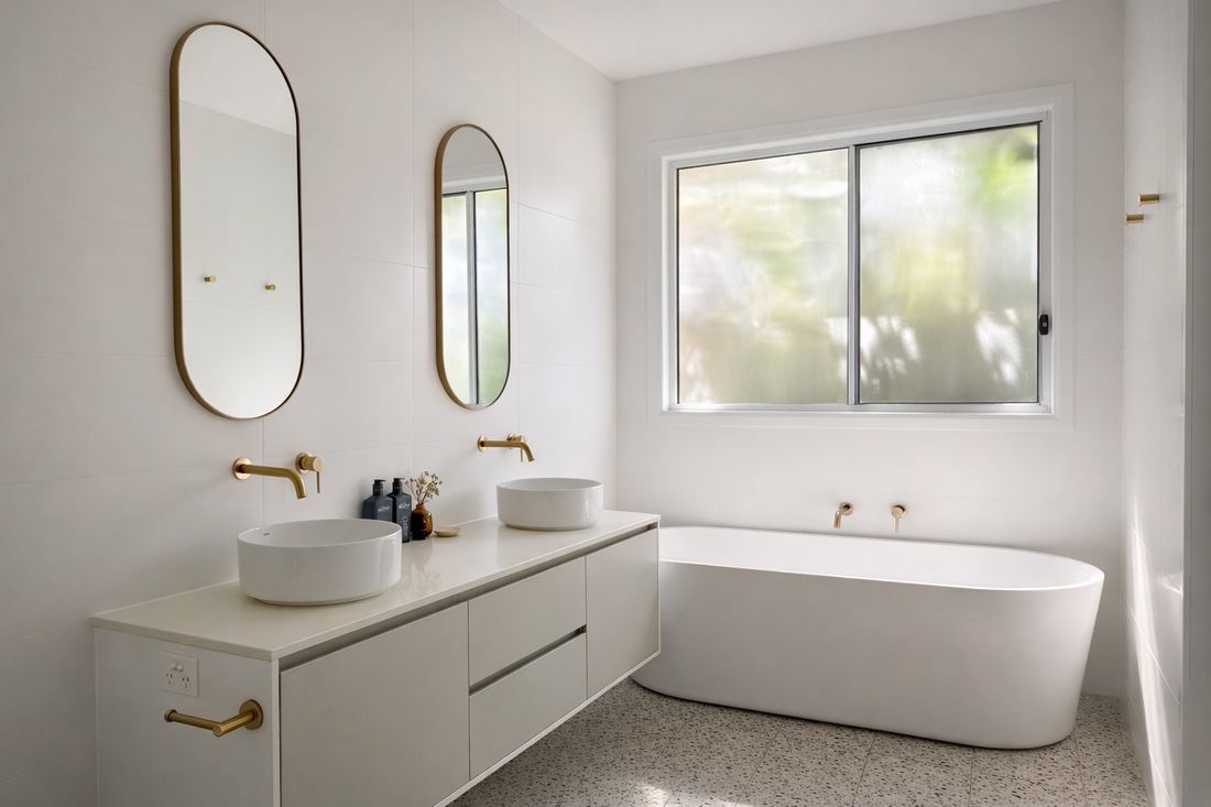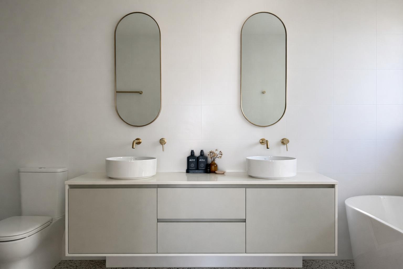 Bathrooms continue the language of clarity and durability, with simple forms, brushed brass tapware and durable stone surfaces suited to coastal conditions.