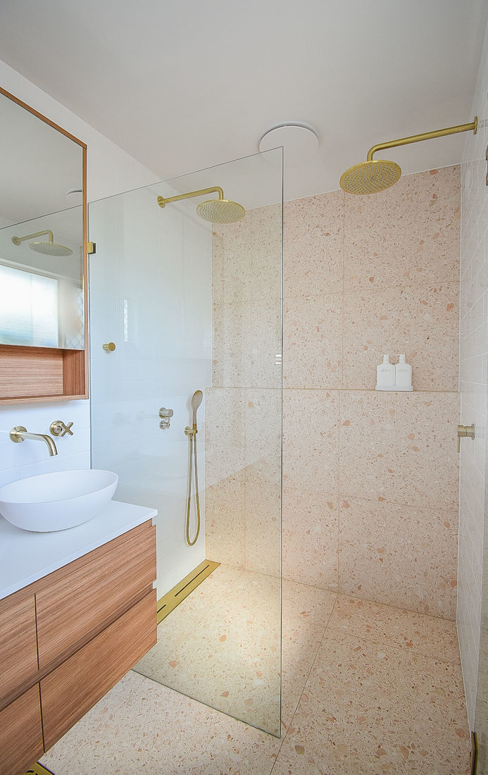 Ensuite; 'Pavlova' Pink Terrazzo by Fibonacci Stone, classic white gloss subway wall tile, customised vanity and mirrored cabinet in NavUrban's 'Byron Blackbutt', ABI Interior Brushed Brass fixtures and basin.